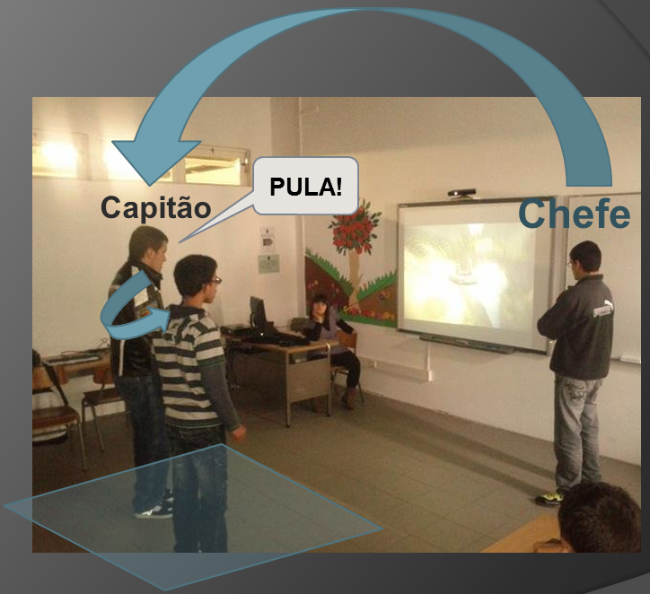 A atividade consistia num momento de cooperação em que um aluno, “o capitão”, dava indicações verbais ao colega num subjogo do Kinect Adventures, em que ambos alunos se deslocavam num barco ao longo de um rio, devendo movimentar-se nesse barco para ambos os lados, podendo, assim, manobra-lo de forma eficaz.